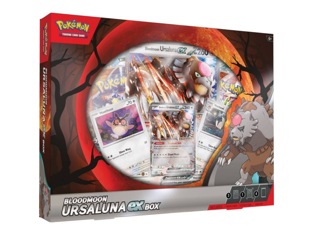 Sada je ideální pro fanoušky, kteří ve své sbírce ocení fóliovou promo kartu Bloodmoon Ursaluna ex, fóliové karty Hoothoot nebo Noctow. Jako překvapení dostanete také nadrozměrnou fóliovou kartu Bloodmoon Ursaluna.