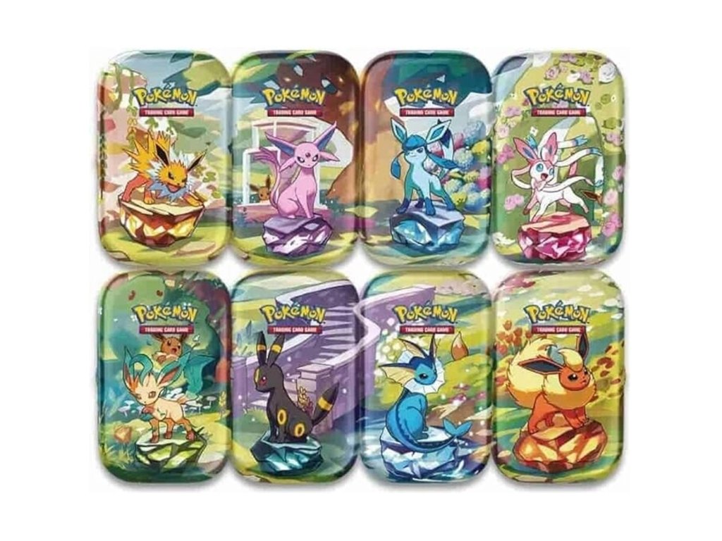 Obsah Mini Tin balenia: 2 boostery Pokémon TCG: Scarlet & Violet - Prismatic Evolutions minca Eevee (1 z 8 farieb) artová karta s Pokémonom z krabičky – zozbierajte všetkých 8!