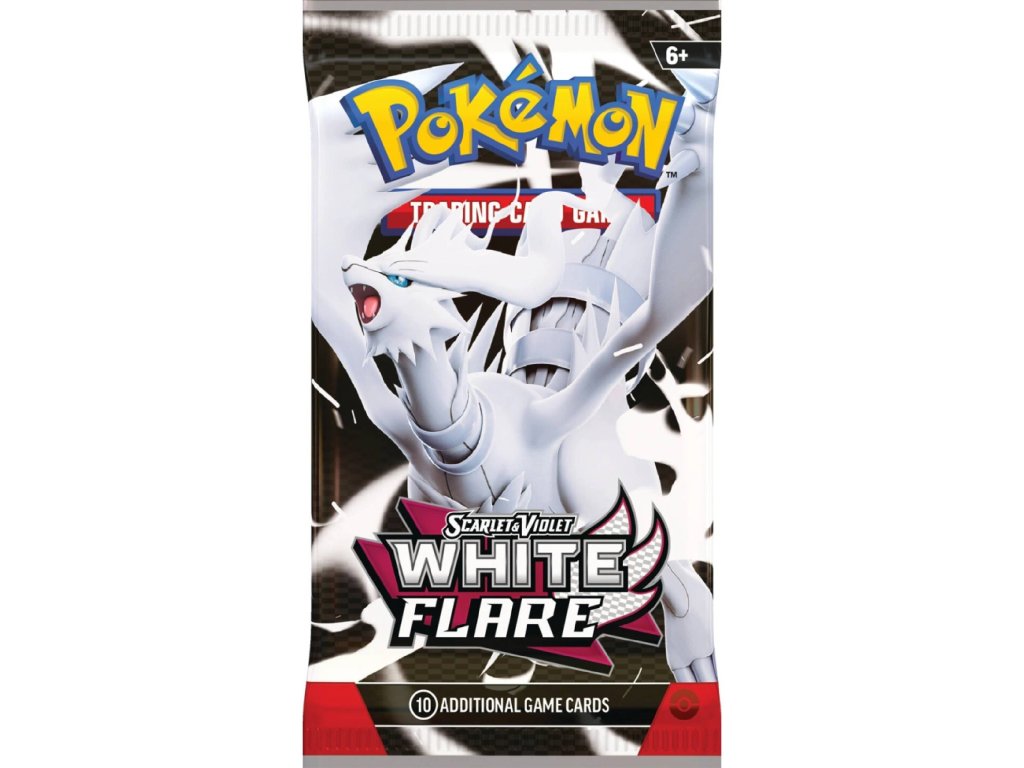 Pokémon TCG: Scarlet & Violet 10.5 - White Flare obsahuje 10 náhodne namiešaných kariet a 1 kartu s kódom do hry Pokémon TCG Live.