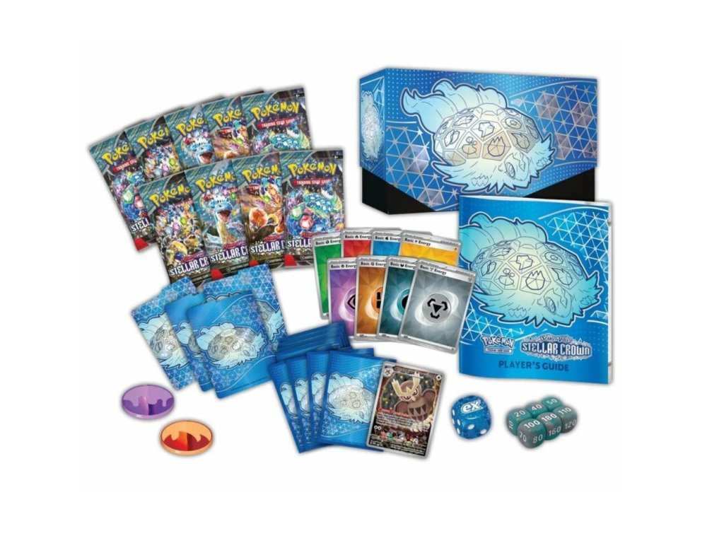 Obsahuje 9 boostrov (balíčkov) zo setu Stellar Crown (v každom je 10 náhodných kariet), 1 full-artovú promo kartu Noctowl, 65 obalov na karty s motívom Terapagos, 45 kariet energií na tvorbu vlastných balíčkov, 6 kociek na počítanie zranení, vyhodnocovaciu mincu, 2 žetóny kondícií, praktickú krabičku na karty so štyrmi oddeľovačmi a samozrejme pravidlá a prehľad edície Stellar Crown (obe v angličtine). Nechýba ani kód na online verziu tohto produktu pre Pokémon TCG Live.